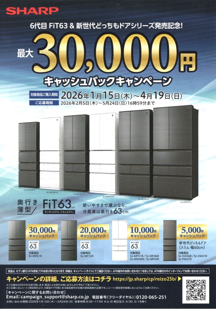 2026年1月15日(木)~4月19日(日)の期間中に、シャープ冷蔵庫対象機種をご購入の方に、もれなく5,000円~30,000円キャッシュバックします。応募期間は、5月24日(日)までです。シャープの特設サイトはコチラ。セブン銀行ATMから、現金を受け取ることができますので、詳しくは当店スタッフまで、お問い合わせください。