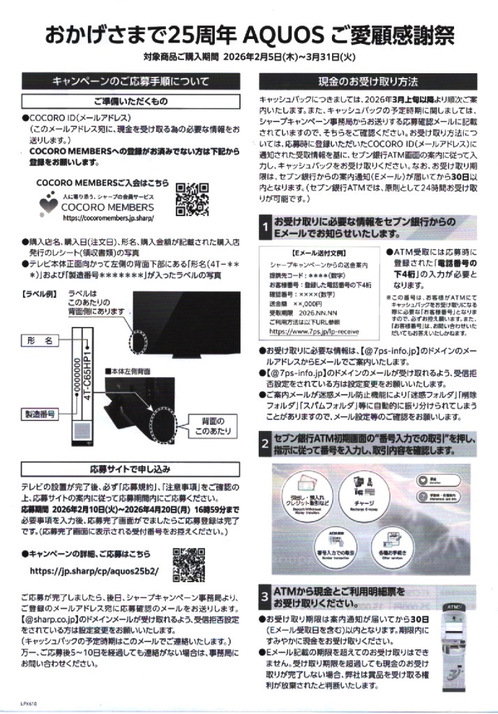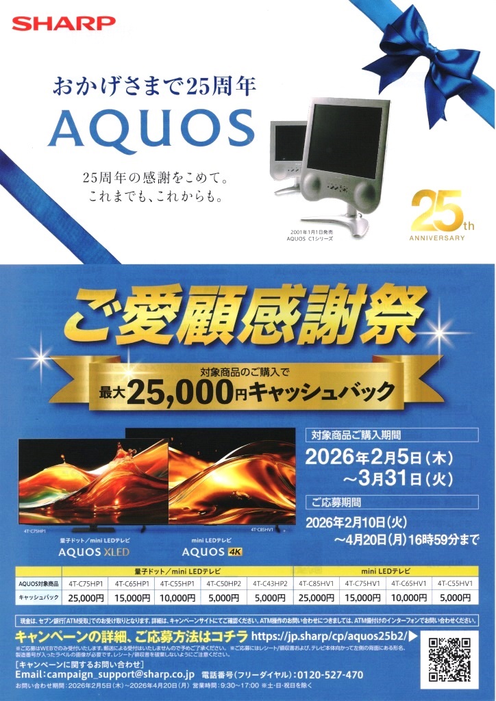 2026年2月5日(木)~3月31日(火)の期間中に、アクオス対象機種をご購入の方に、もれなく5,000円~25,000円キャッシュバックします。応募期間は、4月20日(月)までです。シャープの特設サイトはコチラ。セブン銀行ATMから、現金を受け取ることができますので、詳しくは当店スタッフまで、お問い合わせください。